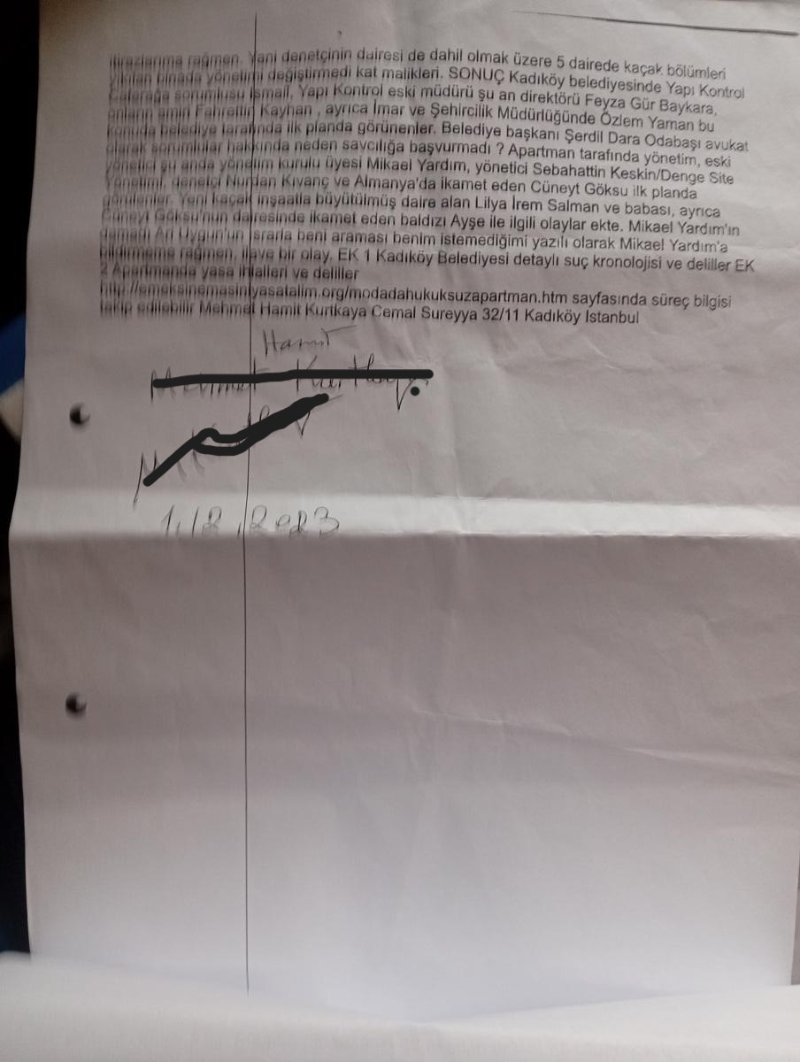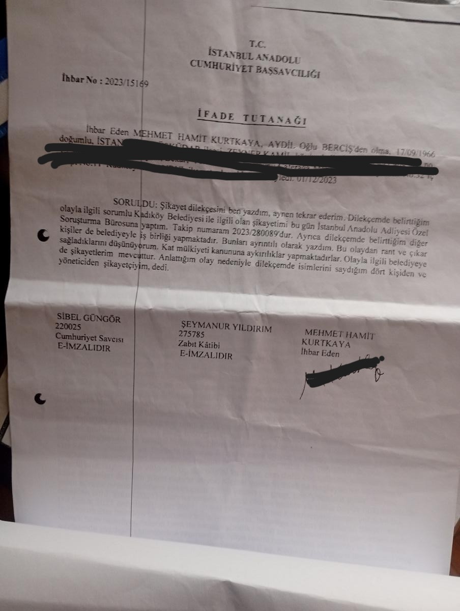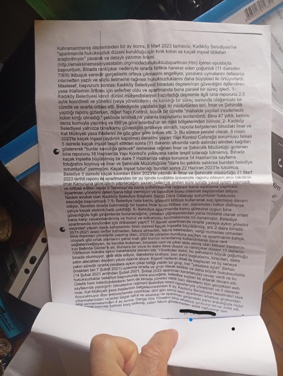 Kahramanmaraş depreminden 1 ay sonra, 8 Mart 2023'te, Kadıköy Belediyesi'ne binamızda hukuksuzluk düzeni kurulduğu, kaçak inşaatlar olduğu ve apartman yönetiminin kolon kırığı gizlediği iddiaları ile iddialarımı yayınladığım web sayfamın linkini vererek başvurmuştum. Bu iddialarım Belediye tarafından tamamen kanıtlanmış durumdadır.