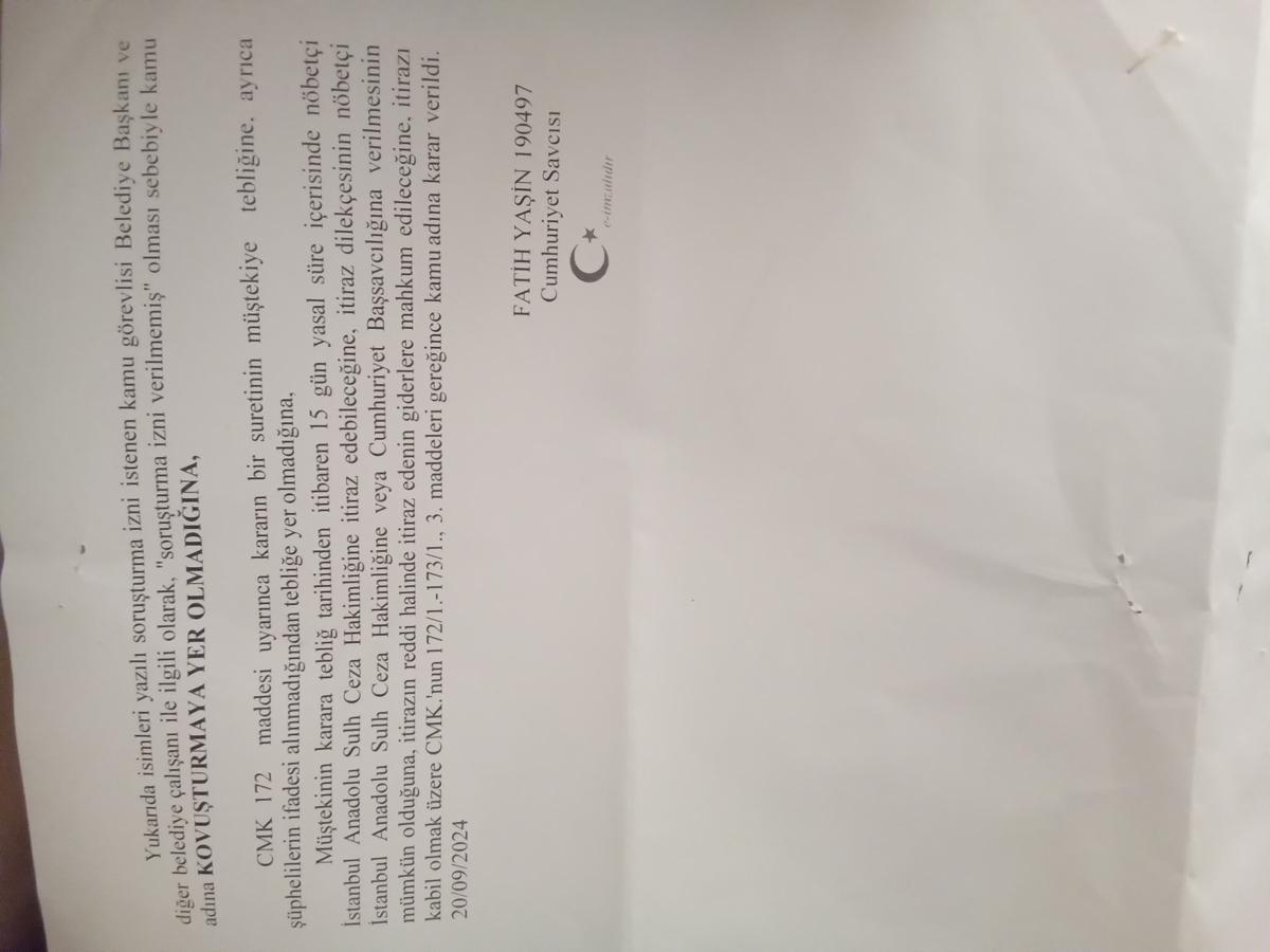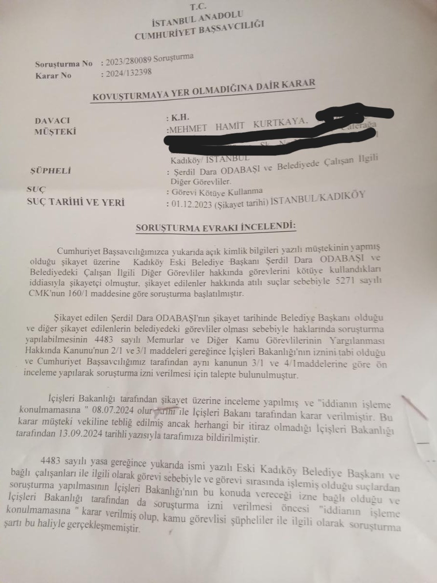 Tarih: 8.10.2024İçişleri Bakanı, şikayetim üzerine ön inceleme yapmış olan Istanbul Anadolu Cumhuriyet Başsavcılığının eski Kadıköy Belediye Başkanı Şerdil Dara Odabaşı ve çalışanları hakkında soruşturma açılması isteğine izin vermemiştir. Başsavcılık ta İçişleri bakanının hukuka aykırı kararını esas alarak kovuşturmaya yer yok demiştir. Her iki karar da hukuka tamamen aykırıdır. Delil Dosyası Ektedir. Resmi Belediye Raporu ve Belediye Yazişmalarını içermektedir.