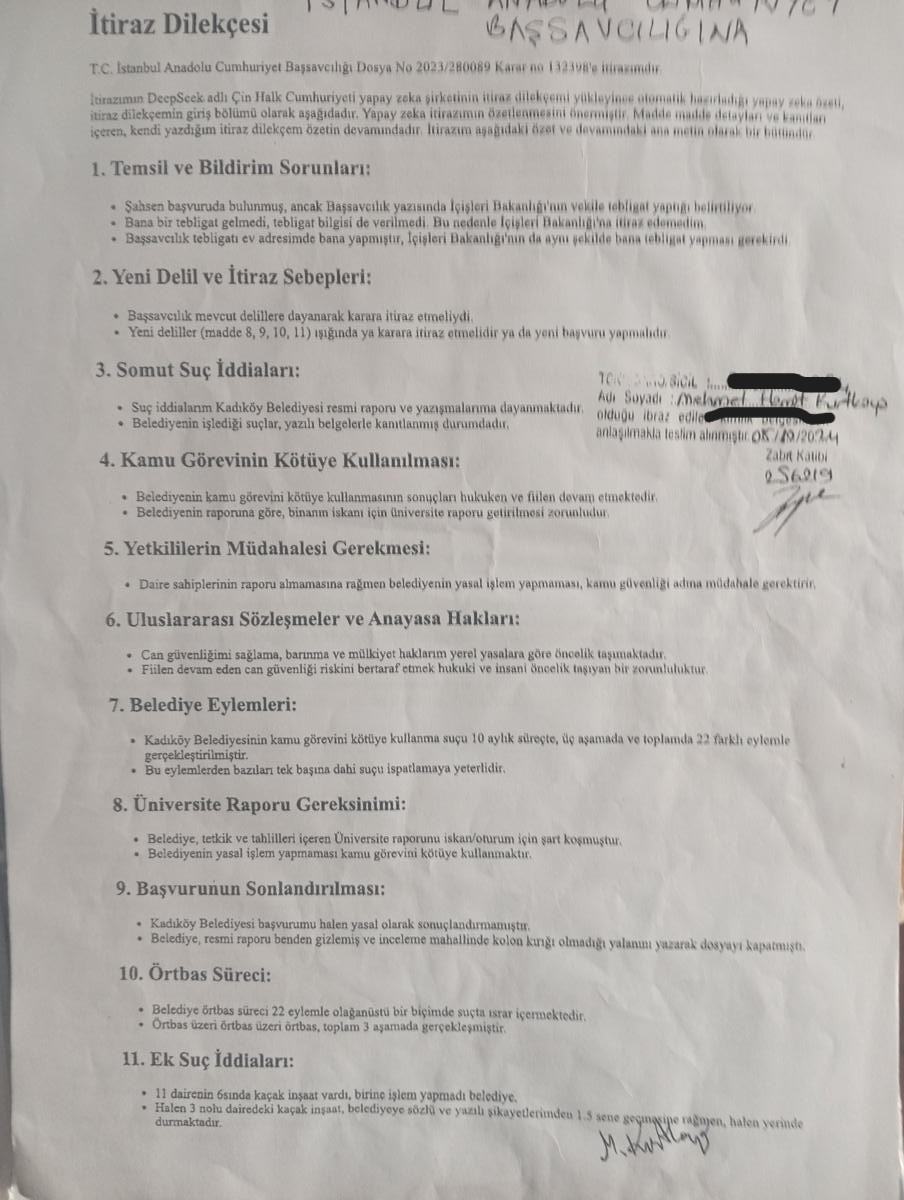 İtirazımın DeepSeek adlı Çin Halk Cumhuriyeti yapay zeka şirketinin itiraz dilekçemi yükleyince otomatik hazırladığı yapay zeka özeti, itiraz dilekçemin giriş bölümü olarak aşağıdadır. Yapay zeka itirazımın özetlenmesini önermiştir. Madde madde detayları ve kanıtları içeren, kendi yazdığım itiraz dilekçem özetin devamındadır. İtirazım aşağıdaki özet ve devamındaki ana metin olarak bir bütündür.